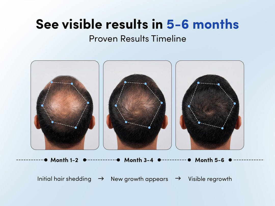 Hair growth takes time, expect 5–6 months of consistent use to see visible results. Month 1–2: Shedding phase Month 3–4: Stabilization and early regrowth Month 5–6: Visible improvement 92.7% of users see results by month 5–6. The Advanced Protocol may show results 4–6 weeks faster than our Essential formula.